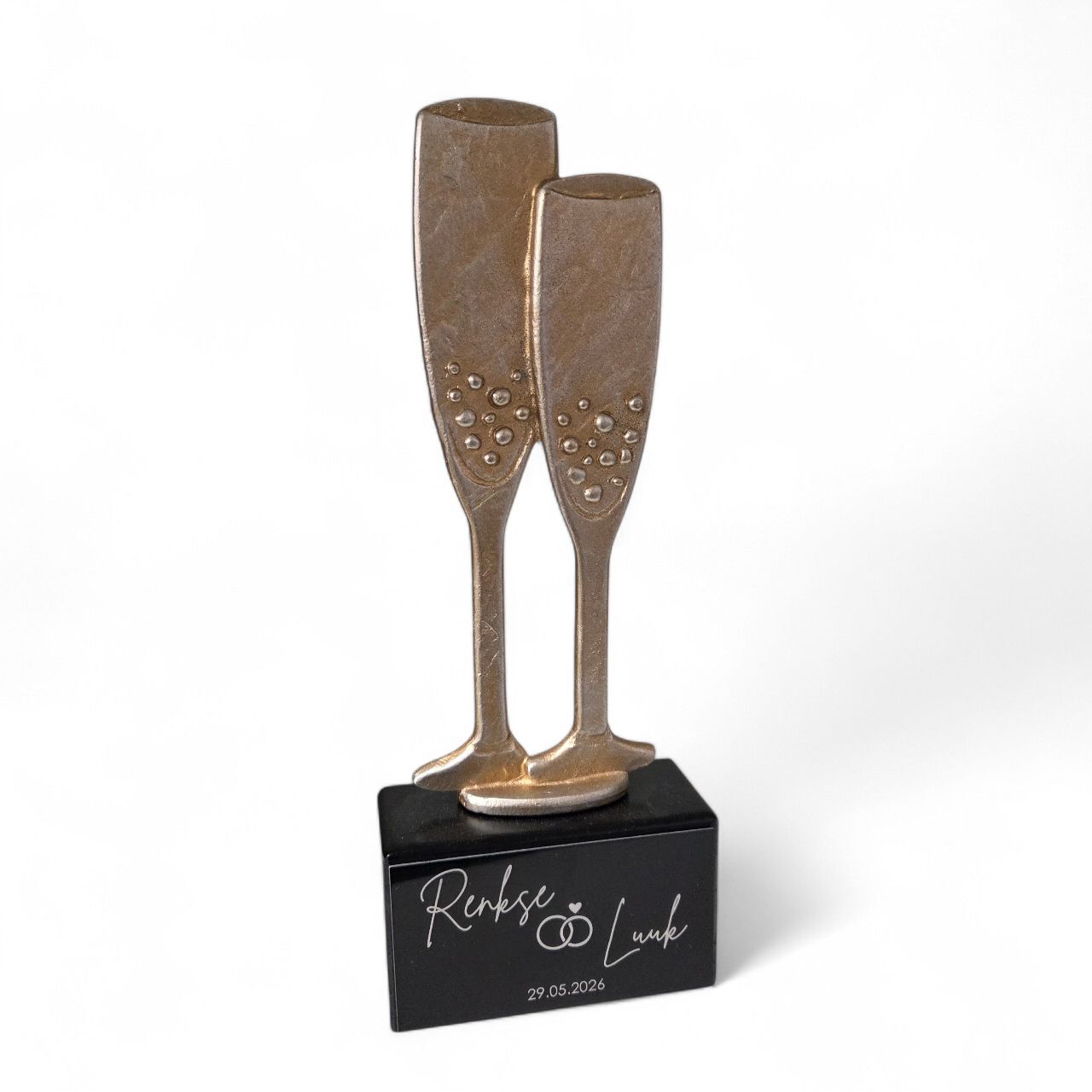 Metalen champagneglazen op houten blok.